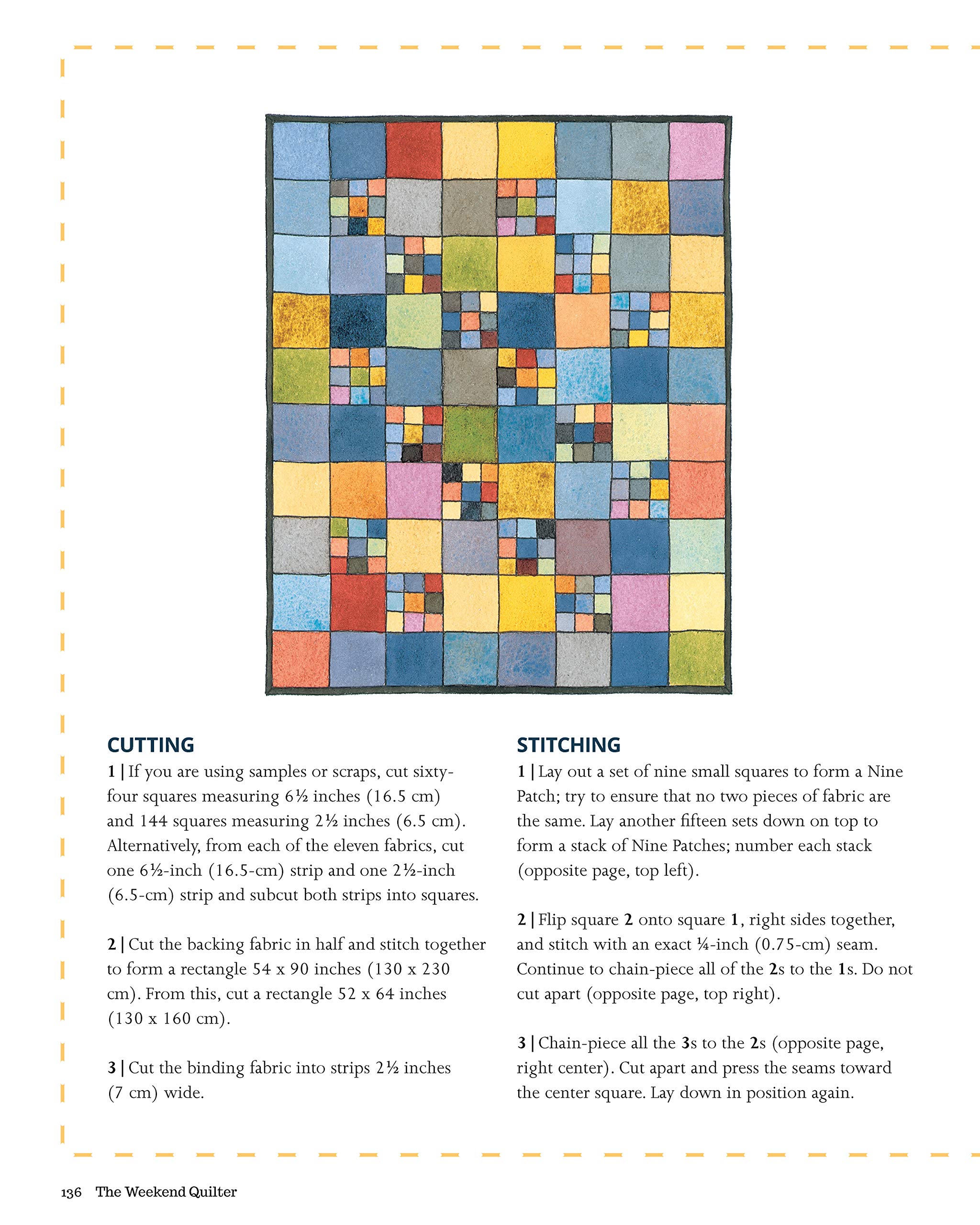 The book starts with a brief history of quilting. I learned that quilting came to Britain by way of the Crusades and that different styles of quilting developed in the U.S. and Britain, though these distinctions faded over time. The book goes on to talk about the tools and materials that are needed for the projects along with an explanation of what tools and techniques make it possible to make a quilt in as little time as a weekend.