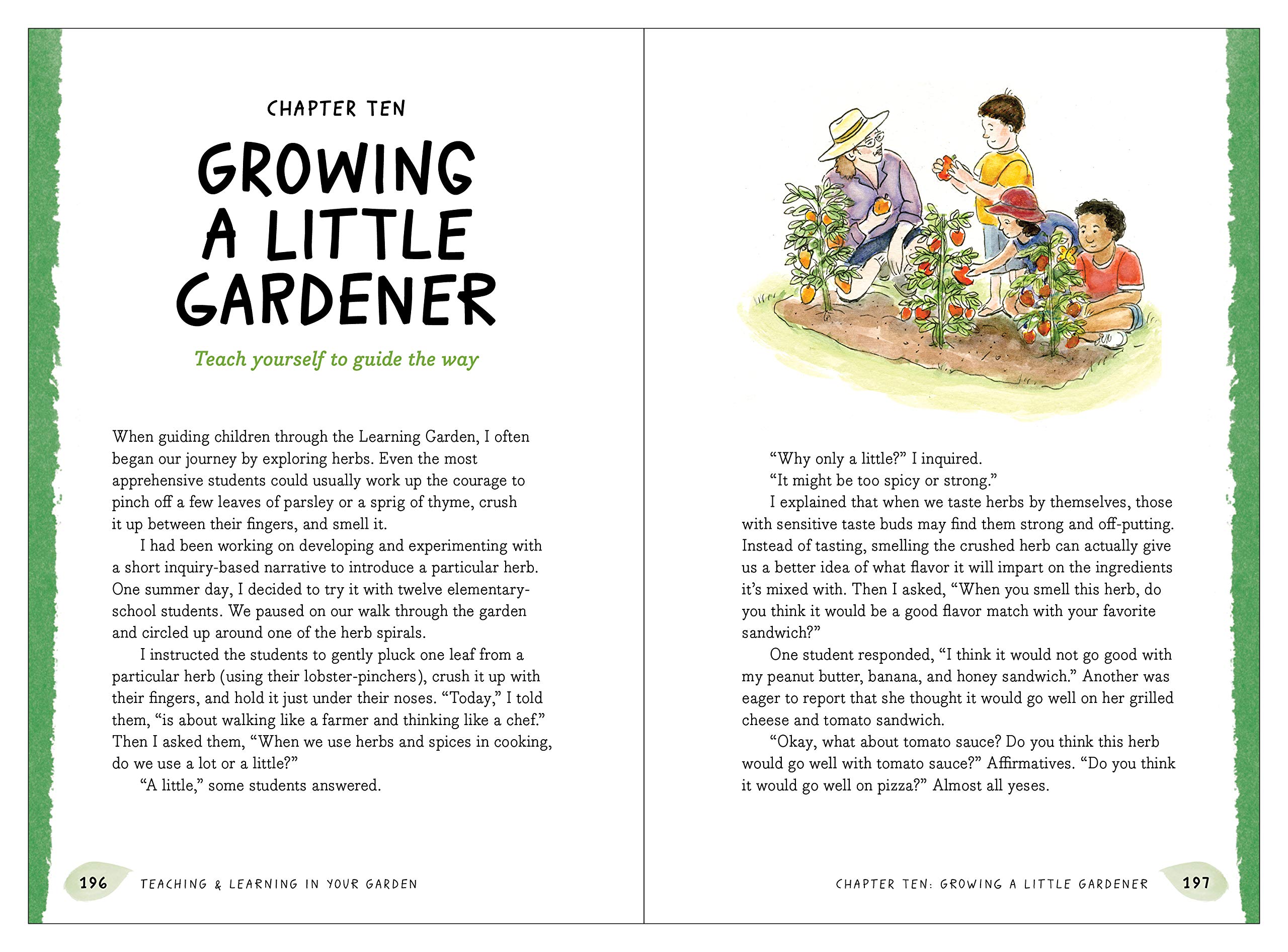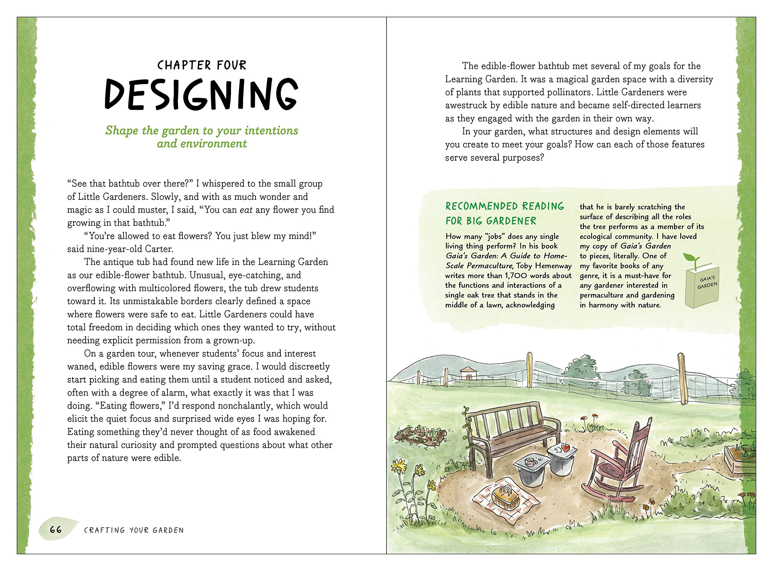 The author of this book cares about the outdoors, children and the growth that takes place in gardens. Her investment is clear in this book. She encourages adults and children to imagine a space and see it come to life over time. She knows that time spent in a garden is time well spent.