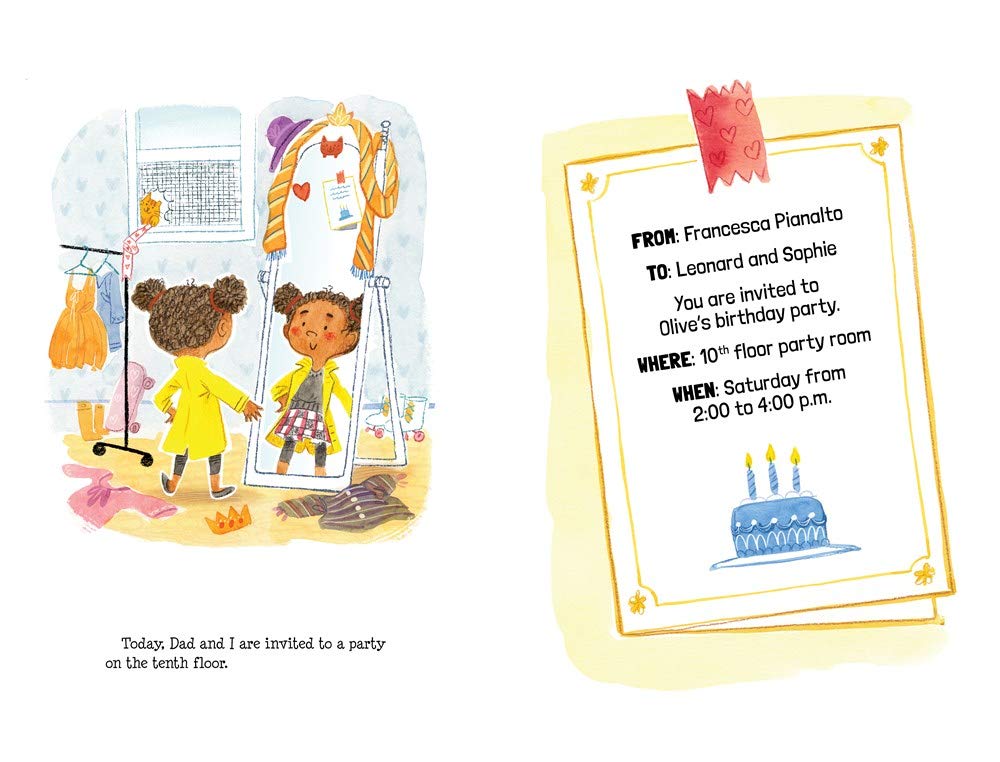 Sophie and her Dad are invited to Olive’s birthday party. They get ready by dressing up and making food to bring with them. When it is time to attend the party, how do they get there? They go by elevator!
