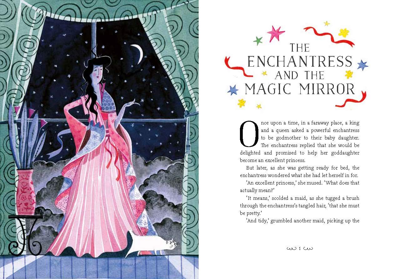 The author draws readers in in the first short chapter of the book that is written in a familiar fairy tale style. In it, an enchantress is asked to be a godmother and realizes that she needs to figure out the best attributes for a princess. The answers she receives do not seem adequate so, with the help of a magic mirror, she goes on a quest to learn more and the stories begin…