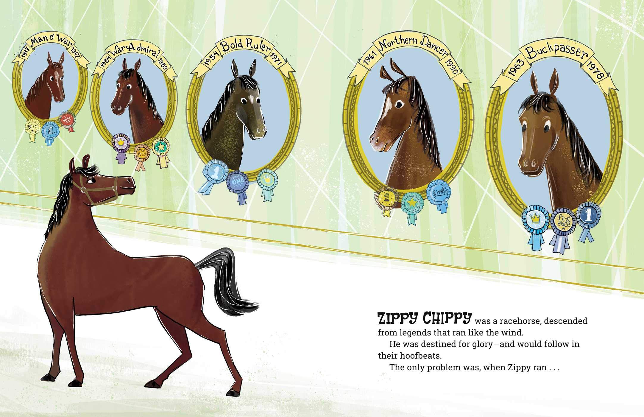 I found this amusing and pleasingly illustrated book to be delightful. Zippy Chippy, whose owner had this as the third choice for his name, was a real racing horse who….just could not race. Zippy was a bit like Ferdinand the Bull; there were so many things that he wanted to enjoy that he often forgot to take off at the start of a race or just could not finish. Zippy NEVER came in first although he had a few places and shows. This left him with a unique record. Nonetheless or because of this, Zippy was very loved. At his horse retirement home, he was the main attraction.