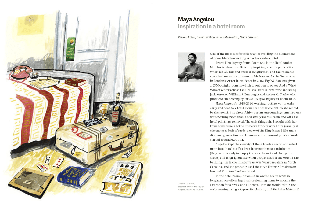 I adored spending time in these writers’ spaces and learning about how they made their choices. For example, Emily Dickinson embraced the “solitude” of her bedroom. She “pretended to lock the door” and noted that freedom was within. Conan Doyle had a very special writing set up made by a well known luggage manufacturer while Maya Angelou wrote in a hotel room.
