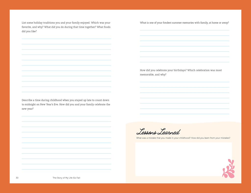 Did you ever wonder what your mother’s life was like? Could you imagine your child(ren) wanting to know about who you were (before they knew you) and are with all of your history and complexity? Are you willing to write a few lines on many topics? If yes, I very highly recommend this journal. It is colorful, includes many quotes about being a parent and asks for answers to questions on topics big and small. A few of these are how you were put to bed as a child, memories of the first time voting, favorite books, what is something that you wish you had known about adulthood and many, many more.