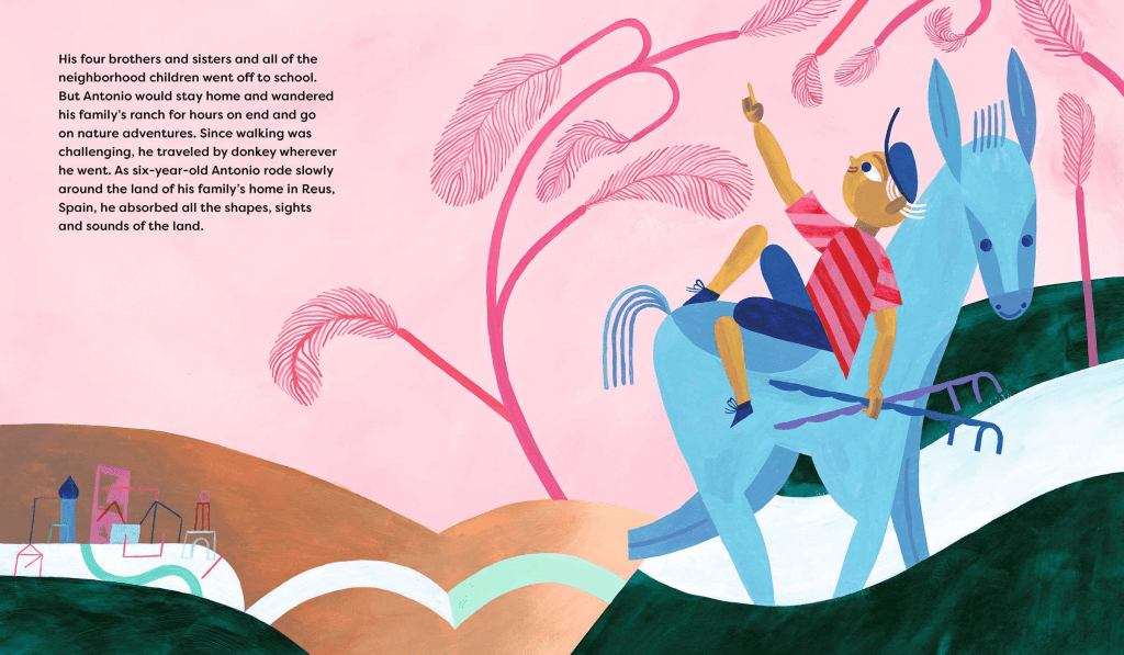 This beautifully illustrated book does credit to Gaudi’s love of shape and his architecture. It tells the story of Guadi from his youth to his death in a straightforward manner. Young readers learn how Gaudi was unable to go to school because he could not walk freely for many years. During his early years, the young Gaudi spent time in nature and came to appreciate the forms that he saw there, especially curved lines.