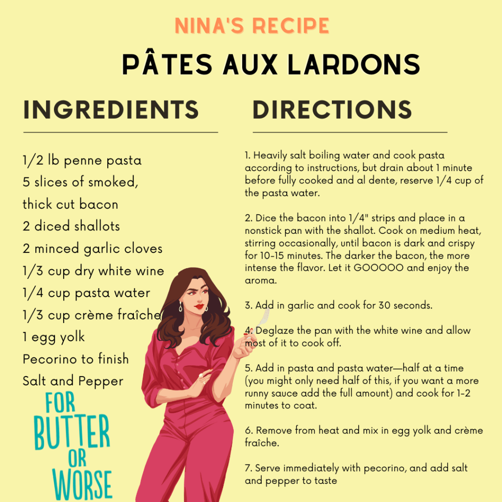 Her cohost on the show was as annoying as a piece of spinach lodged in between her front teeth. He wasn’t a chef. He was a businessman, and his only accomplishment was turning his father’s charming Italian restaurant, Vinny’s, into a bland chain. Unlike Nina, he wasn’t passionate about food—all he cared about was the bottom line.